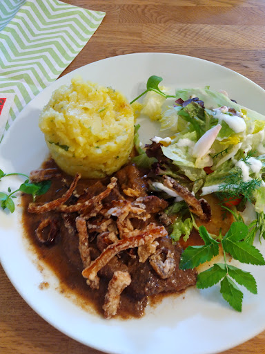 Das Schnitzel hatte eine sehr leckere, gut gewürzte Panade mit Sonnenblumen- und Kürbiskernen. Die Zwiebel bei der Leber waren richtig knusprig. Und auch der/das Gulasch war fantastisch.