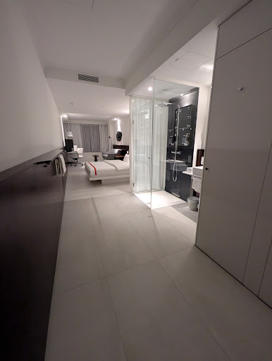 The sink is inexplicably in the bedroom opposite the bed, not in the bathroom. This then takes up a large amount of space where a desk could be, but instead they have crammed a tiny flat 'desk' surface in the corner by the window that is far too small to consider doing work at. The bathroom has a shower that is adorned with 2 full length glass panels that look directly into the bedroom, so make sure you and your roommate are happy with that before you book. There is nowhere to put your suitcases to unpack, so we ended up resting ours on the bed which is not ideal, and there is no wardrobe, just some hangers on a wall with small hooks. Not impressive for somewhere that is portraying a luxury stay.