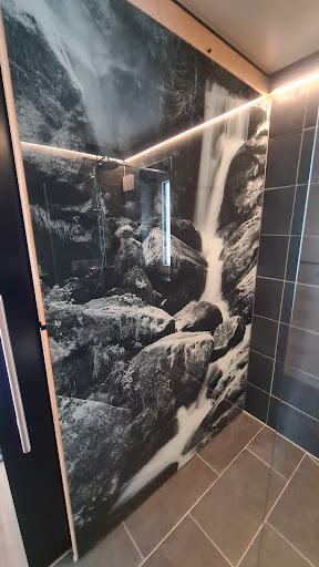 Da das Hotel sehr neu ist, sieht alles sehr schick aus, es gibt kostenlose Parkplätze und kostenloses WLAN. Zumindest letzteres gehört heute allerdings zum Standard, ist also nichts Besonderes. Besonders ist dafür die Abtrennung des Badezimmers mit einer nicht ganz schließenden Schiebetür. Man hört und sieht also ALLES, was im Bad passiert! Man hätte die Schiebetür also eigentlich auch komplett weglassen können. Dann aber wieder doch nicht, denn das Licht im Bad geht nur über einen Bewegungsmelder an, der auch reagiert, wenn man sich bei geöffneter Tür nur vor der Küchenzeile bewegt. Das Licht geht nach Verlassen des Bades auch erst nach einer gefühlten Ewigkeit wieder aus, sodass das gesamte Zimmer minutenlang hell erleuchtet ist, wenn nachts mal jemand zur Toilette musste. Der Abluftpüster geht auch irgendwann automatisch an und jault dann eine ganze Weile vor sich hin. Es gibt ein Fenster im Bad, also wozu noch der Lüfter?