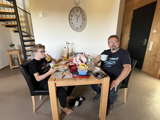 Ich war leider nur 5 Tage mit meinen beiden Töchtern (11 und 17 Jahre alt) in Ferienwohnung 2. Diese ist auf 2 Etagen aufgeteilt - mit Wendeltreppe. Oben ist zusätzlich zum Schlafzimmer (2 Einzelbetten - mit herrlicher Aussicht) eine super gemütliche Sitzecke mit Eckcouch und Fernseher mit Galerie (Blick nach unten in den Eingangsbereich). Wir waren begeistert von der lockeren Aufteilung. Die Wohnungen sind sehr modern und schlicht möbliert, aber durch das viele Holz sehr gemütlich! Die Lage am Berg verschafft aus allen Räumen eine herrliche Aussicht auf den nahen Schwarzwald. Alle Fenster haben ein elektr. Fliegengitter-Rollo. Die Fenster der beiden Schlafräume sind zusätzlich komplett mit Innenrollos abzudunkeln. Das einzig negative war, dass die Matratze für mich zu hart war. Aber ich liege generell gerne weich. Das ist kein Minus für die Wohnung! Leider war es im Oktober zu kalt für den hauseigenen Außen-Pool, den wir sehr gerne ausprobiert hätten! Der schön gestalteten Hof und die Terrasse mit den verschiedensten Sitzmöglichkeiten (teilweise mit Tischen) sind tolle Aufenthaltsbereiche (mit Tischtennisplatte für die Kinder). Den Hofladen und das Café am Freitag haben wir durch unsere kurze Anwesenheit leider verpasst. Für FeWo-Bewohner gibt es eine elektronische Karte für den Eier-Schrank. Der Bäcker ist auf zu Fuß in ca. 10 Min. (17 % Steigung!) erreichbar. Windenreute ist ein sehr schöner, sehr bergiger Wohnort. Von hier aus ist der Europapark, der Kaiserstuhl und der Schwarzwald, mit den schönen kleinen Städten, Wasserfällen, Themen-Wanderwegen usw. sehr leicht erreichbar. Wir waren schon so oft im Schwarzwald und Kaiserstuhl im Urlaub, aber so eine schöne, moderne und dennoch gemütliche Wohnung hatten wir noch nie! Ein großes Lob an Frau Suede für diese...