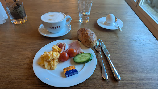 Zum Frühstück: Es gibt kein Buffet zum Frühstück sondern man muss am Vortag via Kreuzliste bestellen, was man am nächsten Tag frühstücken möchte. Etwas umständlich, sehr unflexibel und m.E. Mehrarbeit, die unnütz ist. Auch hier unmotiviertes Service-Personal was gelangweilt hin und her läuft und man bis zu 10min sinnlos rum sitzt, bis man dran ist (wäre bei einem normalen Frühstücksbuffet nicht der Fall). Im Ergebnis bekommt man dann fertige Frühstücksteller mit kühlschrankkalten (harten) Butter und Schokoaufstrich. Große Auswahl an verschiedenen Aufback-Brötchen (hier kann man auch mehr nehmen als bestellt; allerdings keine frischen Bäcker-Brötchen!). Wurst, Käse, Salami, Schinken, Quark, Marmelade, Honig, Schokolade, Wurstsalat wählbar; zusätzlich Ei, Rührei, Bacon, Würstchen, Pancake (werden frisch zubereitet), Joghurt mit Obst oder Müsli sowie Obst-Glas. Was fehlt ist frisches Obst und Gemüse.