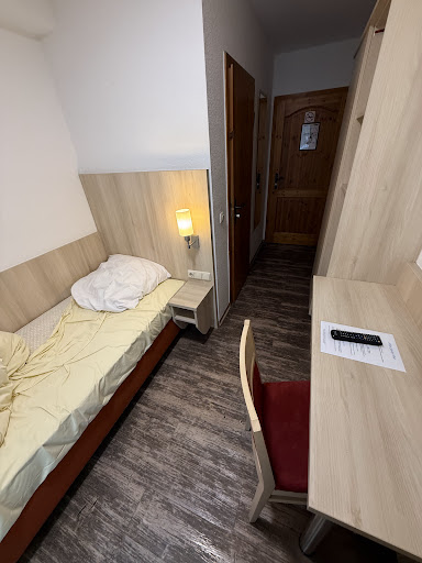 Property in the middle of downtown Zirndorf. a few restaurants and cafes around it. I did not have a room in the main building, but in a small house they have around the corner with a couple of floors of rooms.||||Room was a family room with a double bed in the main room as you walk in. A central hall with a bathroom on the left, a room with bunkbeds ahead, and a small room with a couch and table/chairs/tv on the right. No coffee service, no microwave, no fridge....why bother with a table and chairs???? Functional bathroom with small sink, toilette, shower stall.||||Floors were bare imitation wood floors, so not that comfortable to walk barefoot on. room was a meat locker at first until I cranked up the radiators. Door to the hallway did not deaden sound so the noise from the room across the hall or the entry way was loud.||||Paid 90E .... CASH ONLY....during a trade fair in Nuremberg.||||Did not eat in the hotel other than breakfast....no hot food. Cold cuts, pastries, yogurt, cereal.||||would not be in a hurry to go back, but it was not bad. The area around the hotel was cute. We ate across the street in another restaurant that was excellent...