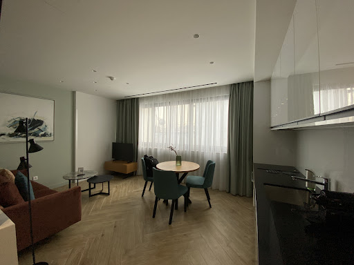Read moreSpotless and spacious apartment in a beautiful location, close to the metro (2 min from Megaro Moussikis) and within walking distance of several good restaurants (eg Agora Select). Roof terrace with views of Lycabettus Hill. Breakfast not provided, but excellent baker at the metro entrance (Megaro Moussikis) serving all kinds of pastries, coffee and juice. Eat in or take away. These apartments are "luxury apartments" - we stayed in 105, which was obviously a wheelchair accessible apartment. There were unfortunately a number of things we didn't like; the bathroom was actually a "wet room" - nowhere to put anything so everything (toothpaste, razor brush, creams, etc.) stayed on the desk section of the main room. The shower was a hand held shower with a manual mixer tap - so freezing/hot if anyone else flushed the toilet. Why they didn't invest a little more in a column with a thermostatic valve I don't understand. Water went everywhere and we had to use a towel to stop it from coming out under the door. You will get your feet wet every time you go to the toilet if someone has used the shower. (maybe put a squeegee in the bathroom). In the main room, someone thought it was a good idea to hang a large TV screen from the ceiling at head height (there was already a TV in the living area!) so you bang your head every time you walk anywhere in the room. (stupid and unnecessary furnishings); at night you will need a face mask - the thermostat is right next to the bed and glows all the time - we couldn't find a way to turn it off. In the corner of room the fuse box flashes blue and white and you feel like you're next to a Christmas tree. Inside the wardrobe there is a safe for your personal items - but again, unlike other apartments we have rented, the safe is a small version and not big enough for a laptop. Choose carefully the room and...
