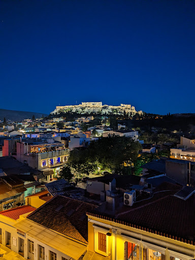 Read moreMonastiraki is the heart of Athens I reckon, and it's so easy to wander down in a few minutes from the metro to Pella Inn. Helpful staff, printed off my flight ticket obligingly with no charge. ||As things were locking down in a few days, I was escaping to Bulgaria. Had to scurry about a bit to visit a few key museums while I still could, but sunny Athens was such a walkable city, up through Plaka to Pnyx etc. And kiosks and fastfood outlets were still open, and I could still wear shorts in November.||Dogleg dorm on the mezzanine was a bit "Being John Malkovich" crossed with a Hobbit house. Anyone over 5'8" risks a bump on the brow. Tall Dutch dudes risk decapitation and/or stooping back problems. But no bunks, and the other two friendly denizens and I had bags of space to stretch out. Horizontally hunky-dory; vertically challenging.||Best aspect by far though: rooftop balcony, looking directly over to the Acropolis, was a hotspot for socialising, cosmopolitan & tons of fun. ||An ideal last hurrah after backpacking, sleeping-bagging 3 days out of 4, because it's expensive for simple get-your-head-down places, 30-odd islands since end of August. Great value, there being hostel competition in Athens; on the islands you're a captive audience. ||A tad officious re check-out time 11am. On the islands much more laissez-faire. But I do understand that things were ramping up in Athens with uncertainty & stress for staff & Athenians & Greeks in general: pressure on changing sheets etc.||Overall, a lovely - albeit briefer than I'd hoped - return to Athens...