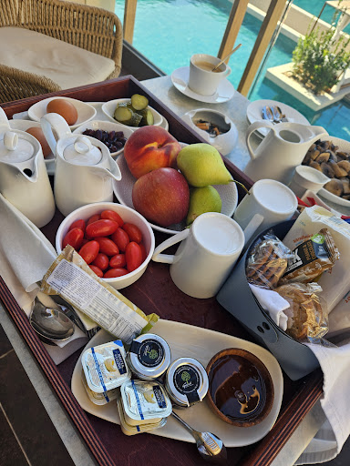 Read moreThis hotel has the highest online rating on Chios Island, but naturally, it's also the most expensive. We checked in during the evening, at the moment we stepped through the entrance, we were greeted by a breathtaking view of a vibrant sunset over the distant mountains behind the hotel - truly awe-inspiring! The hotel opened in the summer of 2024 and currently operates with only half of its rooms available. The ground-floor rooms offer direct access to the pool. The rooms are spacious, with very large bathrooms. A highlight of the rooms is the two extremely comfortable single sofas. The hotel provides a gym and a parking lot. The breakfast is also quite lavish compared to mid-to-high-end hotels in Greece. The service is exceptionally warm and welcoming. Now, for the drawbacks. The hotel's location is quite far from the city center, making it inconvenient to travelers. While the standard rooms are large enough, they lack attention to detail, leading to inconveniences. For example, there's no luggage rack, so you have to place your suitcase on the floor. The bathroom is spacious but there's only one hook and it lacks towel racks, forcing you to place clean underwear on the bath-towels which are left on the floor. There's no vanity counter; the only sink edge is already occupied by the hotel's toiletries, leaving no space for quests' personal items. The spare toilet paper takes up the handrail next to the toilet. Most frustratingly, the hotel follows a common Greek design tradition - an open-style shower with no barrier, allowing water to splash everywhere unchecked, even soaking the towels placed on the opposite side of the floor (with your underwear if you put it over there). Since the hotel serves not only local but also international guests, why nor offer a shower curtain as an option? Despite these issues, as a newly opened hotel, I believe it will see many improvements by the...
