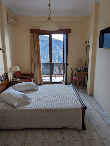 Read moreI think this hotel trades on its views really, and provides the most basic amenities. Friendly and helpful staff are present most of the time. We stayed in the room that is shown with the dark timber bed head and the brocade bedspread. The bed kept sliding away from wall so we kept losing the pillows between. Bedsheets were clean but the light coverlet and bedspread stank. Musty smell and looked unwashed as per the curtains. It’s quite cool and drizzly this spring so the room with no floor rugs was quite cold. Didn’t try air con for heating as very old and as the bar fridge was gritty and mouldy, we didn’t dare turn the air con on for heating. Radiators in the room don’t work. Hot water temperamental. Noisy rooms, there was a loud family next door we could hear all their arguing and phones ringing. It would probably be ok in summer months but in cooler weather it’s just not very warm and you don’t feel like snuggling in a bed that smells musty. No tea or coffee or kettle in rooms but we asked and the lovely reservations manager did provide one for us. Breakfast is extensive with lot more sweet food than most Greek continental breakfasts. I don’t mind a basic value room at all generally but I feel this was even overpriced considering a lot of other accommodation venues. Just a good clean and provide better heating might suffice. Can’t really recommend it much unless you need a short...