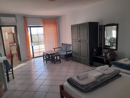 Great place overall with lovely pool deck. We had no.2,a 2 bed apartment which is ground floor so has a good pool view surrounded by vines from the terrace. However the terrace & table is a bit small for 4 (2 adults,2 teens). Cats visited all the time for food,we love cats and they were very friendly but if you don't then get an upper floor room! The rooms are good,1 huge room with 3 beds and small sofa,chairs,wardrobe but no aircon! The other is a double bed with kitchenette and small dining table & 3 chairs with very cold aircon.The kitchen is fine but could do with a couple more big plates. The bathroom is OK with a shower. It's on the main road but it's pretty quiet anyway. Good for visiting the castle,Dimisari Gorge etc. Good restaurants in karystos and 1 nearby ( near garage). We enjoyed...