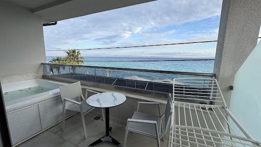 Let’s come back to the positive things though: The bed is one of the best I ever had at a hotel. I tend to struggle with hotel beds, but I had a week of good sleep in this one. The balcony, while having a bit of a mixed view and no sun at all, has absolute privacy, which I appreciated. The jacuzzi is pure bliss at the start and the end of the day. (Unfortunately it also makes a lot of noise most of the time.) The daily service kept everything clean and provided fresh towels and even bedding as needed. The automated curtains keep out the light during the night and allowed for a morning view of the sea while still lounging in bed.