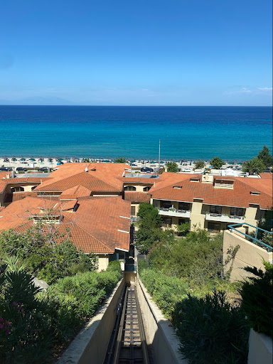 Here’s the run down (+): close to the beach includes breakfast and dinner. There are no dining options unless you have a car. quiet overall shower is strong lots of shampoo and shower gel easy to get a beach chair, even on weekends provided you get there by 10 lots of variety of food elevator to get to villas at top of hill lots of friendly kittens to play with can get beach towels for a 10 euro deposit each quiet beach. Music turns on at 3 so make sure to position your chair accordingly clean sea. It’s rocky so be prepared if you have tender feet. No one wears sandals for the rocks. clear, beautiful water! we heard it was required to pay minimum 5 euros for drinks to use the chairs. Not the case. You can use for free. showers by the beach to wash off the salt and sand pomegranates, figs and oranges growing on the resort