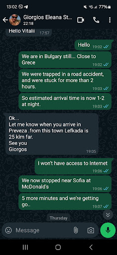 Fast forward to August 2024, having known Giorgio already, I reached out to him directly to ask for a room. We agreed on a price for 10 days, with an arrival set for August 28th at 23:00. All seemed well until we got delayed due to a road accident on our way to Greece, causing us to arrive at 03:30 on August 29th.