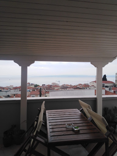 We stayed first in one of the lower apartments and then in the topmost, panorama apartment. They are all excellent, comfortable, spacious and clean, but the panorama one is exceptional. This has large front and back terraces all with lovely views either over the town and sea beyond or the hill to the side. Both terraces have cover so one can avoid the sun if wished, but can also be used for sunbathing. These flats are very good value and are situated centrally in a lovely little town/village on the beautiful island of Evia, easily accessible from Athens. We were struck by how 'Greek' the village was - not overrun by foreign tourists like ourselves, and there is plenty of evidence of traditional life. The town still has lovely little bakeries for instance, with delicious warm bread in the mornings. But it also has charming tavernas and coffee shops on the waterfront.