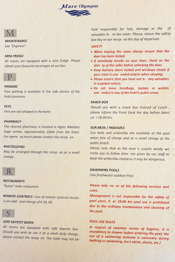 Read moreWe spent a week at Mare Olympus with our family, choosing the all-inclusive option. Unfortunately, from the very beginning of our stay, it became clear that this package does not function as it should. Children were unable to get basic drinks like Coca-Cola or Fanta – the only options were water or an overly sweet juice mixed with water. The hotel bar was practically non-operational – it was often left unattended, and guests would walk away discouraged, unable to order anything.||One particularly disappointing aspect was the behavior of the bartender, Natalia – she was condescending and unwelcoming, giving the impression that she was serving guests against her will. One evening, we tried to use the bar at 10:52 PM, only to be told it was already closed, despite the advertised hours indicating it should still be open. When we pointed out that this shouldn’t be the case, it seemed like the restaurant staff also started treating us differently, as if we had done something wrong.||On the positive side, the food at the restaurant was delicious and varied – there was something for everyone, which deserves recognition. Unfortunately, the service was slow and disorganized. There appeared to be a staff shortage – most of the responsibilities were handled by one person, Sophia, who did her best, but simply couldn’t manage to serve everyone on time, often leaving guests waiting for drinks.||Reception, however, was outstanding – Maria is a wonderful person who truly cares about the comfort of the guests. The room we were given was spacious, well-equipped, and met all our expectations – especially considering this is a 3-star hotel. The location is also excellent – right by a pebbly beach, near a tavern, with a beautiful coastal atmosphere perfect for relaxation.||To sum up – the hotel has potential and several strengths, but it definitely needs to improve its service if it wants to continue offering all-inclusive packages. As it stands, it’s hard to describe the experience as fully comfortable or carefree, which is what such a vacation package...