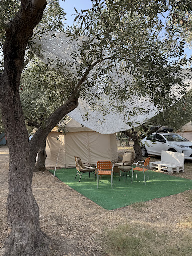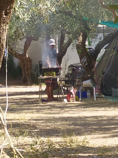 Moving on to more practical information. All areas have shade. Some more so than others. That said, if you'd like to enjoy shade throughout your day you are advised to bring sunshades. In Greece we have olive harvesting nets that I find work pretty well for this. Whatever you end up going for, pick something that allows water to go through it. The same goes for any potential flooring. Reason being there is a slight chance of rain every year and you do not want to be on the receiving end of stagnant water (your mileage may vary). In addition, keep in mind that olive trees restrict wind to the point of relative stillness. Always book in advance as the camping is full during high season. Also, do note that there are neither deckchairs nor umbrellas on the beach in front of the camping, so you'll either have to bring your own or go to the adjacent Café Bar "Ocean". Finally for the things the mini market of the camping can't provide you can go to the supermarket "Praxis (Panagakos)" a kilometre or so east of the camping.