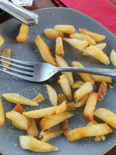 Our room also had its own patio with a table and chairs as well as a sun lounger with thick cushion and large pool towels. The patio overlooks a garden area, partially shaded by trees, and a swimming pool. Beyond the pool was a large conservatory building called the Glass House Bistro, which serves meals and drinks in the evening. Tables for dining are available both inside the Glass House and in the garden. There is a small bar.