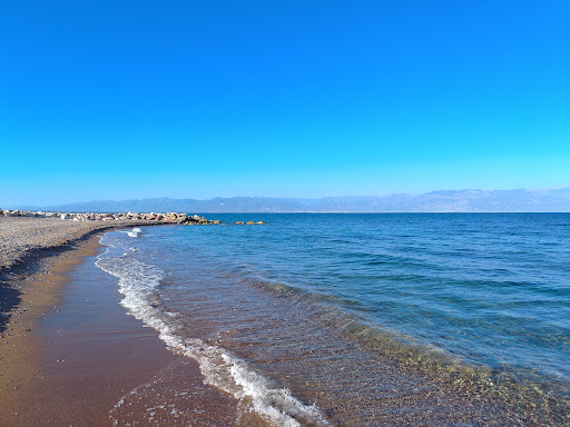 There is 2 private beaches one is free and the other you pay €12 for some nicer undamaged sunbeds, the beach itself is a beautiful view however be prepared to purchase some beach shoes as its all pebbles. Be aware the bar at the beach only provides alcoholic beverages unless you purchase the sunbeds where the young lady down there brings you water in an ice bucket.