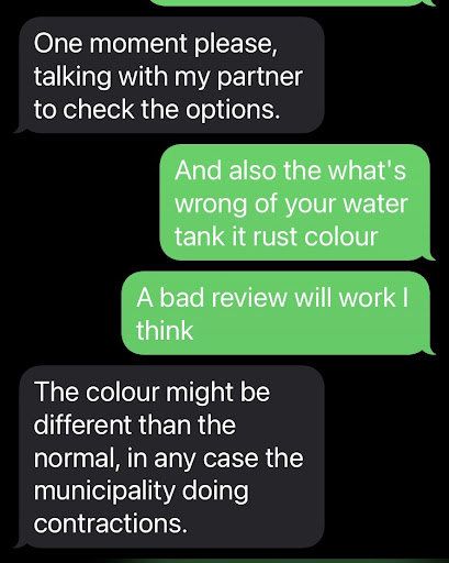 This is terrible experience tonight ! The room no.7 hot water boiler broken , it didn’t not last long while I start showering, so I had a cold shower waiting in a cold room, and I tried to go back continuous showering and hope hot water working but still didn’t last long for 2’min maybe. Also the water colour looks rusty dark yellow, I don’t know why… So I contacted them asking them come to fix and asking what happen of the water. The manager said : “The colour might be different than the normal, in any case the municipality doing contractions. “ I don’t think this is truth as he haven’t seen yet.