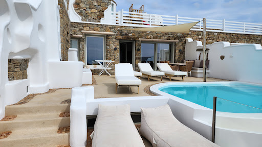 My friends and I stayed at Divino for a week. We had a 2 bedroom unit with a pool. Each bedroom had an ensuite bath.||The villa units are separated by traditional Greek walls, a combination of white plaster and native rock. Artful water features offer pretty focal points with the soothing water sounds which act as a sound dampener between units.||The view from each unit of the harbor, Mykonos Town and the hills beyond is absolutely stunning in any weather.||The units are a blend of modern and rustic, with beach boho chic decor. The furnishings are comfortable and inviting. The lounge chairs around the pool and lower terraces are high quality and very comfortable. Dining options inside and out.||The unit we had was filling with natural light from the many windows. Drapes and shades offered privacy if desired, but no one can see in anyway.||The unit was furnished with plenty of dish and glassware, silverware, cookware and utensils. It had a small dishwasher and washingachine with a drying rack.||Housekeeping came daily, if desired. The property manager, Katerina, was friendly, helpful, and attentive.||There is a family of cats and a sweet little dog on property, which we all loved having around. (we all missed our pets.)||Divino is close to town - walkable in nice weather - but far enough away to be able to get away from it all during season.||I really enjoyed my stay and would be happy to return. Definitely a home...