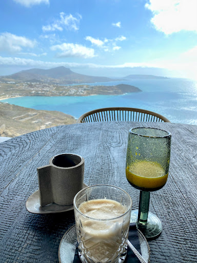 The picturesque property, situated at the top of a mountain overlooking Elia Beach, offers jaw-dropping panoramic views of the island. Photos don't do it justice. Designed in a bohemian-chic style, it exudes an atmosphere of panache and serenity. Our room was spacious, featuring a private terrace with an outdoor jacuzzi and daybed, a dual-shower (fun!), and an incredibly comfortable bed and loveseat.