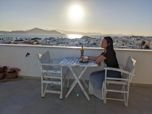 Read moreAfter our booked accommodation was unable to accommodate my friend and I (there was a leak which had caused no electric), we were offered a stay at Oniro Studios at no extra cost. We were quickly collected by one of the owners, who kindly carried our (very heavy) backpacks and showed us to our room. The room was lovely and clean - private balcony with a view of the sea and sunset (amongst the houses), comfortable bed, en-suite, WiFi, linen and towels, wardrobe space, mirror, hairdryer, kettle etc. The rooms are cleaned daily, and to a spotless condition. Breakfast (tea, coffee, bread etc, biscuits, and another ‘surprise’ option - we had peaches one day, and Greek yoghurt the next) is served daily from 9.30am on the roof terrace, which also has a great view of the sea and rest of Naxos. The roof terrace is accessible at all times, and I suggest watching the sunset on it. You also have your own keys to come and go as you please. The accommodation is in a great location - near the beach, main square and port (a restaurant called To Elliniko is also close and is amazing). The owners will also hold your luggage for you on your departure day, and bring it to you at the port in time for your ferry. In a nutshell, clean and nicely decorated rooms, excellent service, and kind owners. I would...