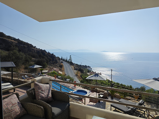Read moreAn absolutely stunning view over the Mediterenian Sea, part of the coastline and the mountains. |We can truly recommend this wonderful boutique hotel. ||We stayed in the turqoise suite on the 3rd level. But all suites have stunning unblocked views to the sea. ||Huge porches and all suites have private gardens. Good beds and sofas. ||The breakfast is delicious. Though it is served in a very small area the selection is big and freshly made. All breakfast tables and sunbeds have amazing views to the sea. Even when you are in the pool or the jacuzzi you have a splendid view. ||Very clean and spacious suites. Nice kitchen and dining table both inside and outside in the shade. All suites face east/south so you will enjoy the morning sun and some nice shade in the hot afternoon. ||The maid service is daily and very attentive. |The staff are so nice, attentive and helpfull. They really make an effort to make you feel at home. ||You might have figured it out already… but since everybody have a stunning view you are quite high up. And there are some stairs to walk! And a very steep driveway not for inexperienced drivers. ||The beach can be reached walking down the mountain on a small steep dirt path. In july in 36 degrees it is pretty strenous! But the beach is worth it all! You share almost 700 meters of natural beach with 6 other people! The beach consists of small pebles and some larger stones but walk in your sandals to the edge of the water and step out in the water on the softest sand!! All of the bay is pure soft sand with no stones or rocks under water! There are no seaurchins and the water is warm and crystal clear. Further out there is nice eelgrass which is proof of a healthy bay. You can snorkel along the coast to either side. You can visit the beach on your right side or just experience the beautifull coastline and some sealife. ||The hotel has no neighbourgs on either side so no noise or music. ||Great restaurants in Paralio Astros (Zorba) (9 minutes drive) and a nice supermarket and luxury bakery in Astros (8 minutes drive)||Suggestions: a beach umbrella in every room to bring to the beach. 2 sunbeds on the porch instead of the 2 deck chairs would be great!||Good value for money. |One of the best views ever and a really great hotel! We would love to come back and we will recommend this hotel...