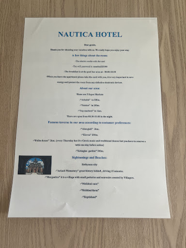 Read moreI liked very much, priceless, to have breakfast and drinks by the sea, with a wonderful view of deep blue sea. It was easy to organise my day between spending time on the beach and swimming in the sea or refreshing at the pool bar or having a calm swim in the pool. I was impressed by the discrete, warm, and kind relationship the manager shows in the 5 days of my stay. She is very much client-oriented, keen to understand and fulfil client's needs and requirements and also listening and considering client's suggestions to improve the facilities and service. I enjoyed the quiet and calm environment (it is really a peaceful place to relax - no touristic crowd type of venue) and nearby you have two lovely taverna with great food and service as well -Taverna Eleven by the sea was my preferred. Easy and cheap than taxi also to take a coach back to Heraklion -the bus stop is few hundreds meters from the Nautica and Elephtheria -the venue manager- advised me how to take it. Definitely Nautica Hotel Apartment and its lovely surroundings have a space in my heart and I wish myself to visit the place again soon... and hope you...