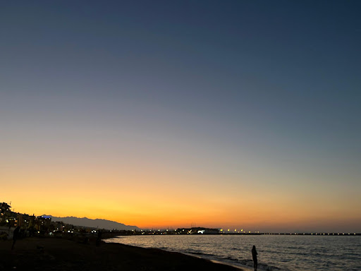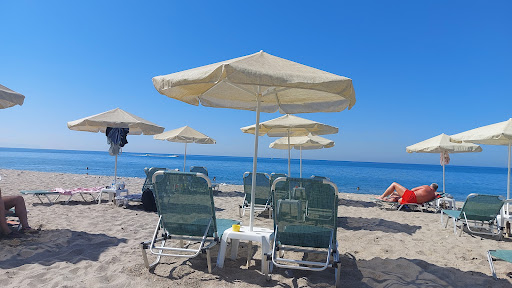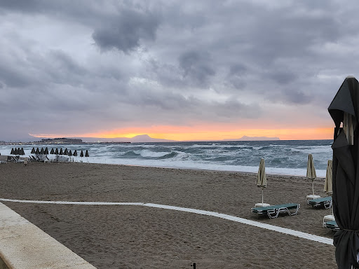 Just in front of the hotel, there's a restaurant that also belongs to the property, and the beach is right across the road. The sunbeds are practically free — all you need is to order any drink for €3.5 or more, and the sunbed is yours for the whole day.