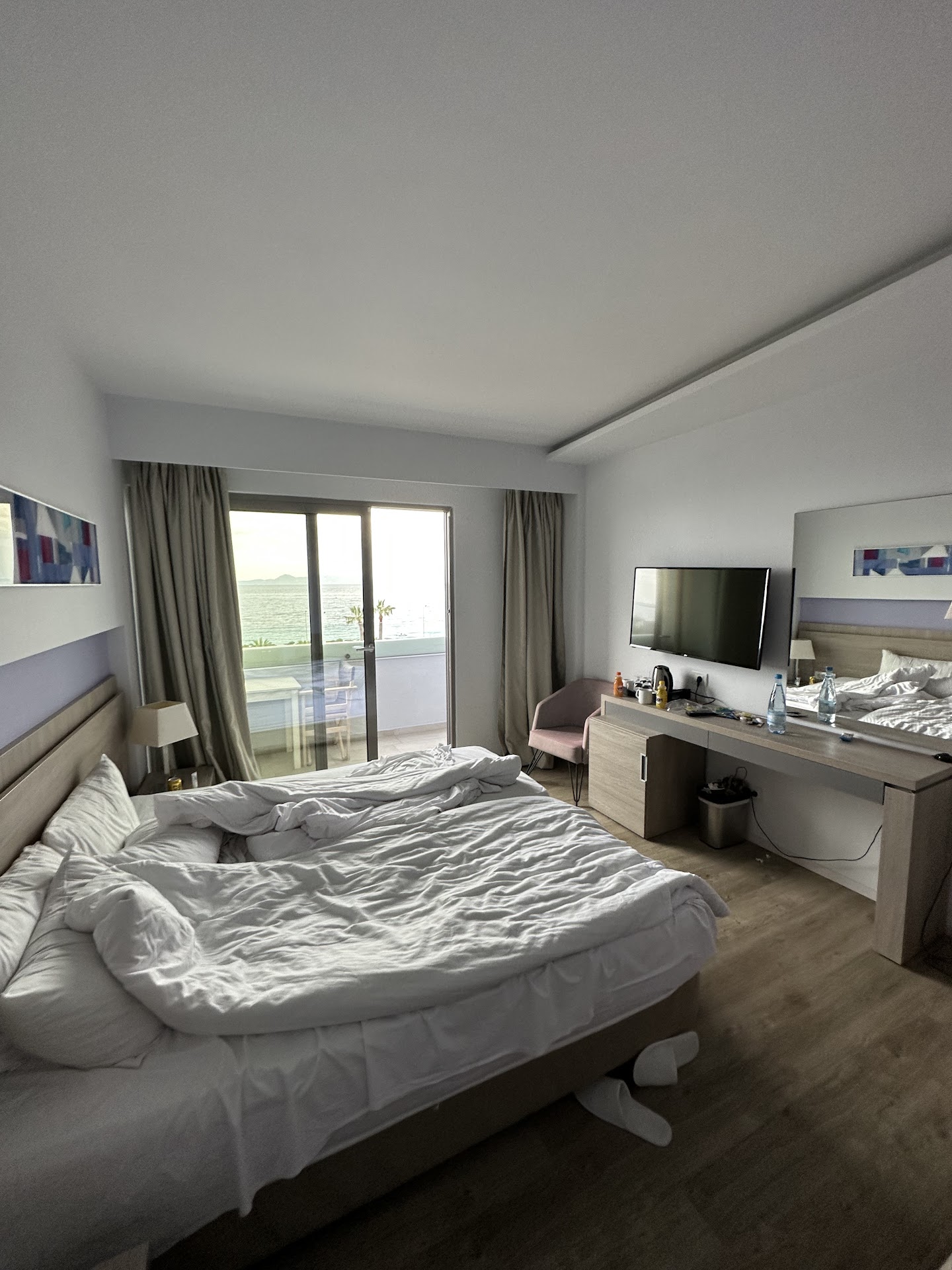 We booked a partial sea view and had a fab view. The room had 2 single beds put together which did become a little bit annoying as they slid away from eachother very easily. The beds were very comfy otherwise and the pillows were thick and great to sleep on. The room was very modern with a decent sized tv which unfortunately didnât have many English programmes on most the time or any smart features like Netflix etc. We were expecting a walk in shower but it was a shower over three bath but wasnât a problem, the water pressure is great and is a great shower. The mini fridge was restocked whenever they cleaned our rooms, which for us we asked them usually every second day. The wifi was good and reached our room we were on the 4th floor.