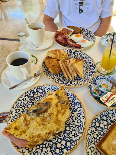 Friendly family run hotel. Staff are wonderful, always have a smile and customer service is excellent. Located a 10 minute bus or taxi ride from Rhodes old town. ( Taxi €12, bus tickets €2.30 if bought from nearby shops - buses can be crowded and a bit unreliable in the middle of the day) Beaches are monopolised by the large hotels with a public access beach 15 minutes walk North away ( in front of Anna's Place - opposite Oceania Beach hotel, the one that looks like a UFO has buried itself in the cliff. ). The nearest access to a pebble beach is down the streets opposite the Hippocampus, located between the Avra Beach resort and Ixian Grand, but it has no facilities.( just the beach, no sunbeds, bar or toilets) fishing boats are on the shore and there's O Brien's surf rental shack. We were told that at top of the street - Hotel Natalie - you can use their pool, sunbed and bar. Described as a 'gastro pub' the hotel food does not disappoint and local dishes appear to be their speciality. Breakfast in particular is huge. Tea, coffee, orange juice with croissants cake and toast to keep you going while they cook a fresh English breakfast, for you - or an Omelette or scrambled egg and more toast.