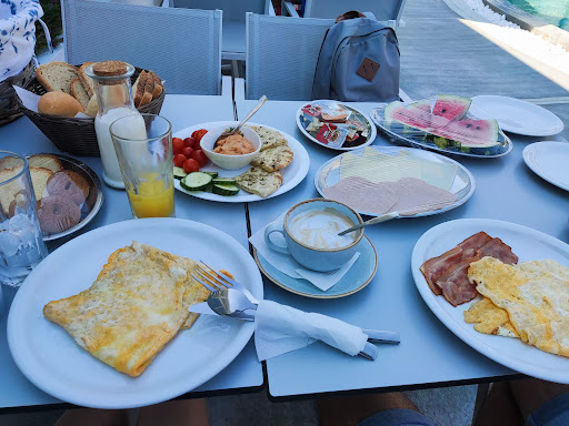Breakfast is luxuriously in choices and quality. you can have it in the breakfast/bar area or at your room. It's made up of ham, cheese, marmalade, honey, fresh fruit, greek yogurt, milk, fresh orange juice and eggs however you want them; boiled, omelet, omelet with bacon or cheese, horses eyes, ... To drink you can have tea, coffee, frappé, .....