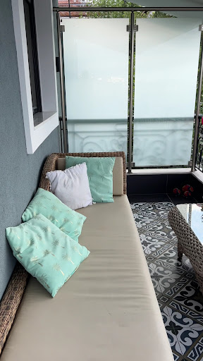 Our room has a beautiful balcony overlooking the town. It was more like a terrace than a balcony. Very comfortable L shaped settee with coffee table and colour cushions. Our room was very well equipped with tea and coffee machines fridge and the necessary. The shower was to die for, I loved it. And the decor of the whole place was very stylish and well done.