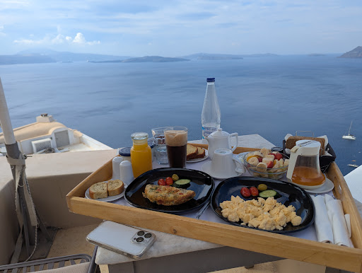The room itself was perfectionâan excellent view, a dreamy layout, a private hot tub, and a balcony that felt like pure luxury. Waking up to breakfast in the room with that view was everything we needed, especially as Santorini was our last stop on our holiday.