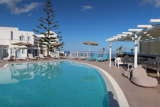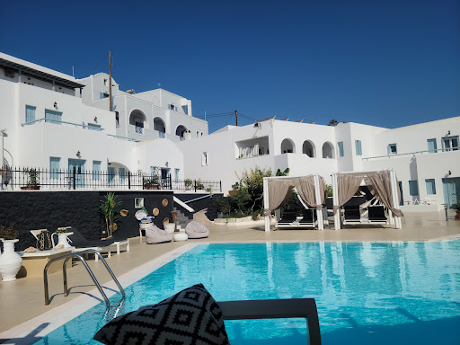 Read moreThis is a beautiful hotel right at the centre of Thira, the capital of Santorini. From the hotel there are extensive views across the eastern side of the island away from the caldera. The hotel consists of a series of Cycladic buildings in a semi circle around a pool. The rooms are accessed from the pool area either directly or via stone steps. Our room was up a flight of stone steps and was reasonably spacious with a patio, air conditioning and an en-suite shower room. The air conditioning was directly in from of the bed, which caused some problems with the draught. In addition there was a serious lack of storage space for anybody staying more than a couple of nights.||The walk up to the edge of the caldera from the hotel was a relatively short distance but involved quite a climb or a walk along a busy road with no unobstructed walkways. This is a hotel not to be recommended for seniors or for those with mobility issues. Santorini and particularly Thira is not to be recommended in July and August as it is far too busy. While we were there, in addition to the hoards of regular visitors, most days there were four cruise ships in the caldera.||In the hotel, breakfast was served in the room and had to be either ordered the day before or in the morning if we were prepared to wait. The order form consisted of five optional menus which were all almost identical except of the savoury options. Breakfast was then eaten on the balconies or patios. Strangely there was no pool service despite the presence of an underutilised bar adjacent to the reception.||The hotel staff were wonderful, very friendly and helpful. My wife had neglected to pack some vital medication, but the staff came to the rescue, contacting a local pharmacy a short distance away who had the medication available to be purchased over the counter at a very low cost.||In conclusion, this is a hotel with immense potential that does not seem to be being realised. A pool service and a breakfast facility would greatly enhance the charms that are inherent...