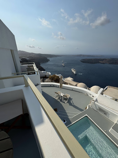 I spent a full week on Santorini and hiked almost the entire island — including the famous trail from Fira to Oia — and I can confidently say that this hotel has the best location for caldera views. The view from the balcony is simply breathtaking. You honestly don’t need to go anywhere — the sunsets here are perfect, right from your own terrace.