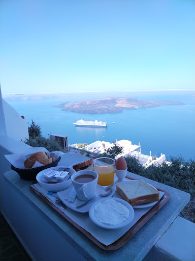 Read moreFirst beginning with the positive, the breakfast was good and definitely a nice addition. The main highlight, however, is the views from the rooms and especially from the hotel terrace where you can go and have breakfast or just sit to watch the sunset. In this hotel you are really paying for the location and the views of the caldera. I would even argue that this specific hotel potentially has one of the best views in the whole island.||||However, the bathroom was way too small, including the shower which has a poor design which caused water to spill everywhere and the shower curtain is sticking on you due to lack of space (quite nasty). There are no electricity plugs in the bathroom, so if you want to use a blow dryer in front of the bathroom mirror, not the hotel room for you. Finally, we were charged tax at the end despite having already paid it through Booking.com according to booking confirmation.||||Overall the hotel staff was very friendly and hence it was a mixed experience. If the bathroom was bigger and the shower was bigger and better designed this hotel would be improved...