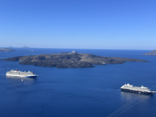 For us the absolute highlight of this hotel was the pool. It has spectacular view of the Caldera and a lot of Fira, and that combination beat my high expectations. I have held a romanticized vision of Santorini for decades, and to finally go there and have reality exceed my expectations, and to be able to soak it in for hours from the (albeit small) pool was one of the highlights of our 2-week trip to Greece. I was worried I would get to Santorini and would find that the great view only existed from a particular angle in one corner of Oia, but the island and its Cycladic architecture is just spectacular all over. The only drawback is that this is no secret so in busy season every gorgeous view is mobbed with tourists, but the pool at this little hotel gave us a chance to enjoy the view as much as we wanted, without having to dodge the thousands of people taking photos after being disgorged by the cruise ships below. The pool is not large, but very few in Santorini are. The common balcony on the higher level is also small, but the vibe during our stay was generally pretty friendly, and we had enjoyable times hanging out with some of the other guests from Australia and the States.
