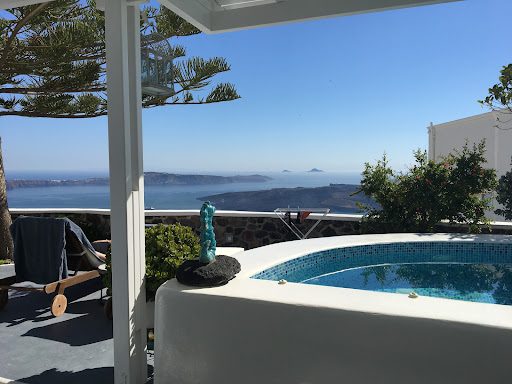 This place is beautiful. We stayed here for 7 nights celebrating our 5th wedding anniversary. Upon arrival Ionas had a fresh vase of flowers waiting along with a bottle of wine in the fridge. He is very accommodating helping to have our laundry taken to be done (at our expense) and even providing us a cellphone to use to make local calls and to call him if we needed anything. The balcony is big with a nice hot tub and manicured plants and trees. The view from here is amazing and the residence is very private with nobody actually having any views of you in your hot tub because you're at the top of the hill looking down upon other people. This Villa is very centralized near the capital of Fira and also available to have food delivered from just about any restaurant in town. If you decide to rent a car or 4 wheeler you have parking right outside your door but on a first come first...