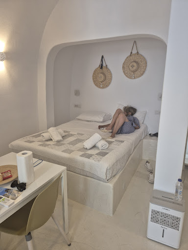 We found this place on Air B&B. Was probably the best of all the ones we used on our vacation. Nikos, the host was fantastic throughout our entire stay with great communication, as well as being on site to interact with. The house is awesome! Just so different than what you may be used to, if you always stay in hotels. Because of its construction, it is quite cool inside while very warm outside. The beds were comfortable, and it is a short walk to the center of town where you can catch the bus to Fira which will take you everywhere else on the island...