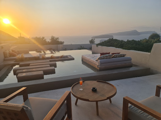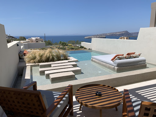 Read moreWe stayed in Suite 5 for 4 nights for the last part of our holiday and it was beautiful. I picked this room specifically when booking as it looked to have the best views and a more sheltered hot tub although all of the other rooms looked amazing from what we could see. The room was very spacious, bright, cool and decorated modernly. Our suite was 2 bedroom with one double bed on the first floor and one double bed up some small stairs into a sort of loft/cave like type room which was very cute. Both beds were very comfy. Very nice and spacious shower within the room itself. There were some kitchen facilities in the room including a fridge with items to buy from the mini bar at reasonable prices which was handy when not near a shop and this was re-stocked whenever requested. Also a Nespresso coffee machine (be aware that all water is salt water so is not drinkable at all so worth stocking up on bottled water for things like the coffee machine/kettle). There was a small living area with a tv, sofa and table. Inside on the first floor there was a day bed next to some small bi-folding doors which opened out into an incredible hot tub with a great view of the sun set and island. The outside terrace was down a flight of stairs and had everything we needed. Seating area with a table for our delicious morning breakfast which was served at a time requested by us each morning. The breakfast was different each day which was great. The pool was a perfect size for the two of us and although quite cold it was great to cool down in. There were two lounge beds, one under a pergola type thing (although not much shade once the sun comes around) and one in the open right in the pool with a beautiful view out onto the sea. We ordered room service a few times and although it wasn’t top restaurant quality it was still good for what we wanted. The staff were attentive and very helpful with the receptionist taking us through local recommendations at check in and answering any questions we had. Although we were aware this place was further out from other places, be prepared that your nearest mini/super-market is in Akrotiri centre which is around a 10 min drive (20€ in a taxi) / 55 min walk. So would recommend either stocking up on your way here with what you will need or renting a car/quad. It is the same with the bus stop as this is also in Akrotiri centre so will require a taxi/car. A taxi to Fira is around 40€ in a taxi and 2€ on a bus. It was an amazing, chilled and luxurious stay here and...