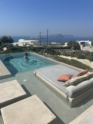 We stayed in Suite 5 for 4 nights for the last part of our holiday and it was beautiful. I picked this room specifically when booking as it looked to have the best views and a more sheltered hot tub although all of the other rooms looked amazing from what we could see. The room was very spacious, bright, cool and decorated modernly. Our suite was 2 bedroom with one double bed on the first floor and one double bed up some small stairs into a sort of loft/cave like type room which was very cute. Both beds were very comfy. Very nice and spacious shower within the room itself. There were some kitchen facilities in the room including a fridge with items to buy from the mini bar at reasonable prices which was handy when not near a shop and this was re-stocked whenever requested. Also a Nespresso coffee machine (be aware that all water is salt water so is not drinkable at all so worth stocking up on bottled water for things like the coffee machine/kettle). There was a small living area with a tv, sofa and table. Inside on the first floor there was a day bed next to some small bi-folding doors which opened out into an incredible hot tub with a great view of the sun set and island. The outside terrace was down a flight of stairs and had everything we needed. Seating area with a table for our delicious morning breakfast which was served at a time requested by us each morning. The breakfast was different each day which was great. The pool was a perfect size for the two of us and although quite cold it was great to cool down in. There were two lounge beds, one under a pergola type thing (although not much shade once the sun comes around) and one in the open right in the pool with a beautiful view out onto the sea. We ordered room service a few times and although it wasn’t top restaurant quality it was still good for what we wanted. The staff were attentive and very helpful with the receptionist taking us through local recommendations at check in and answering any questions we had. Although we were aware this place was further out from other places, be prepared that your nearest mini/super-market is in Akrotiri centre which is around a 10 min drive (20€ in a taxi) / 55 min walk. So would recommend either stocking up on your way here with what you will need or renting a car/quad. It is the same with the bus stop as this is also in Akrotiri centre so will require a taxi/car. A taxi to Fira is around 40€ in a taxi and 2€ on a bus. It was very windy during our stay so keep all your belongings pinned down and indoors during the night or they will be gone by morning! It was an amazing, chilled and luxurious stay here and...