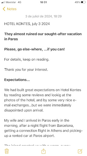 HOTEL KONTES, july 3 2024||They almost ruined our sought-after vacation in Paros||Please, go else-where, …if you can!||For details, keep on reading.||Thank you for your interest.||Expectations…||We had built great expectations on Hotel Kontes by reading some reviews and lookig at the photos of the hotel, and by some very nice e-mail exchanges…but we were immediately disapointed upon arrival.||My wife and I arrived in Paros early in the morning, after a night flight from Barcelona, getting a connection flight in Athens and picking-up a rented car at Paros airport.||The island greeted us with a warm, sunny, brilliant morning! All was running perfectly well!||… and Disapointment||And then, we dropped our luggage at the corner next to the hotel, and we immediately realised the Hotel Kontes we were standing in front of was, and was not, the one we had seen online and had booked for our vacation in Paros.||We were exhausted from the night long travels and could not believe what we saw. The hotel was not really first line in front of the harbour, but hidden beside a corner, the sea could only be seen from the alley to the enttance…||The reception was unwelcoming. There was a stange perfume floating on the air. Our room was not ready yet (we had asked for an early check-in, which could not be guaranteed due to the hotel being fully booked).||We could not stay at the reception to rest. There is not a nice hall a to relax…||Worst of all, the much-desired breakfast existed only in photos. ||Breakfast||The hotel has no restaurant nor a coffee-shop, and the breakfast the hotel includes in their offer is a totally unappetizing pre-set continental breakfast, with filtered coffe.||That breakfast is offered at the terrace of the neighbouring restaurant, and there is no possibility to change the set menu, exclude it from the booking or get a refund.||Yes, the terrace you see on the hotel website does not belong to the hotel…||Since that breakfast upon arrival was not paid for in the reservation, we went for a proper breakfast at the hotel Oasis, right in the corner overlooking the harbour and the opposing Krios beach.||Luck||The Oasis Hotel staff, led by Maria, was so welcoming and simpathetic that we even checked if they would have a room for us.||We were lucky, for they had a vacancy, and we could start in a standard room and then move to a room with a sea-view!!!||Is there a way out?||After finnishing breakfast, we returned to Hotel Kontes to check for the possibility to cancel our reservation, and ready to accept a penalisation.||It was June 28th, a Friday early in the morning, and demand was high, so we expected the hotel would not be much damaged||No-way!!!||We would have to pay for the whole booking of four nights. The receptionist claimed not to be entitled to return the money (that, by the way, had not been charged yet against the credit card…)||After trying to negotiate a way-out, we surrendered and asked to file a complaint, but we were indicated to reach out for the office (in Athens), which would not open until 10 am, two hours later… So the receptionist (Gillian) offered to send a message to the officer in charge to get in touch with us…later.||Sea-view?||When we had tried to book through Booking, some weeks in advance, we could not find a room with sea-view for our dates, and checked with the hotel for availability. They could not guarantee the sea-view for there was a booking overlap, but maybe… and we finnally booked direct.||Some days passed away, there was no indication that we would get a room with the sea-view and we finnally settled for a “deluxe room, flexible rate, breakfast/breakfast”||No need to look for the sea-view rooms… there are only two of them in the hotel (so they said), probably always booked.||What you see…is what you get!||Compliments for the photographer: he or she made a great job making the hotel look just in front of the harbour, by the sea…which it is, but hidden behind a corner…And making Hotel Kontes looking more appealing and warm by far that it is actually.||The photo of a nice breakfast table set in front of the harbour…is virtualiy impossible with the current terrace. By the way, the restaurant does not belong to the hotel, nor the breakfast in the photo is what you get included in the price.||Ending||We finnally stood in the Hotel Kontes, to avoid paying twice the hotel.||The room is correct, the bed is not very comfortable (according to my wife).||The aiconditioning is noisy, but neccessary. It provided fresh air at night, and also a disturbing light.||Since we had already paid for it, we went to try the breakfast…and let it there and went somewhere else, and paid teice for breakfast every morning.||We reminded Gillian our wish to get in touch with management, every morning, and she promised to send another message every time. We are about to land back in Barcelona, and we are still waiting for a reply from the office…located in Athens.||Paros has been a great experience, much enjoyed, in spite of our poor...
