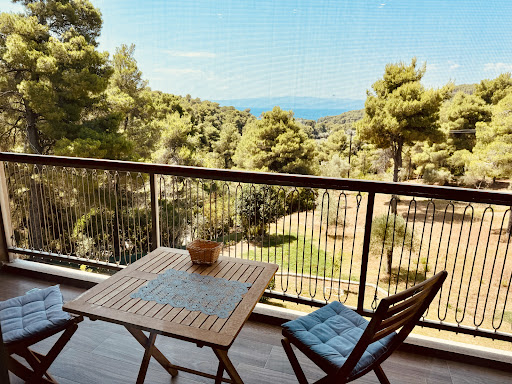 Η τοποθεσία του μοναδική: σε ύψωμα, ώστε από το μπαλκόνι να αγναντεύουμε στο βάθος τη θάλασσα, και να ξυπνάμε με την πρωινή αύρα του δάσους. Σε απόσταση λίγων λεπτών με το αυτοκίνητο σε μερικές από τις ομορφότερες παραλίες του νησιού, και στο ενδιάμεσο αρκετά σούπερ μάρκετ, ταβέρνες, φούρνος, ώστε να μην μας λείπει τίποτα. Είχαμε έτσι την επιλογή είτε να τρώμε εκεί κοντά, είτε να παίρνουμε προμήθειες και να ετοιμάζουμε σνακ / φαγητό στο πλήρως εξοπλισμένο κουζινάκι του δωματίου, και να το απολαμβάνουμε στο μπαλκόνι.