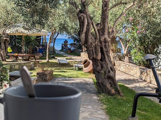 Amazing location to chill, if you are party person i do not recomend it, furniture is little bit old, but you have everything you need, private beach and garden are so beautiful and relxing. I am in love with this place, regret that booked only 4 nights. Useful information: nearest market is 7 km away, road is a little bit chalenging, but after second ride we get used to it. 2 taverna near location. Recomend to visit wild Marmaro beach and Olive beach. This is view from our balcony where we drink cofee...