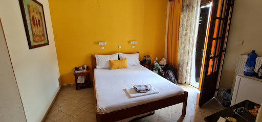 First of all this is the most cleaner place I ever rent. It comes with a big yard with plenty of parking places, the host is lovely, in the yard you will find olive trees and shade for the car, a barbeque place, a big common fridge and a mini fridge in the room. The rooms are little, but offers all you need. A minus will be that the room came with a single plug in socket for electricity, so you will need a power plug extender to charge your stuff. Other minuses are: the distance (2,4 km) between this place and the nearby beach, the shower doesn't come with a cabin, only with a bath, but the balcony is huge. A very beautiful beach is near by (2,4 km). It fits my taste. Here you will find: sand, rocks, stones, beach bars with sunbeds and sun umbrellas (diversity regarding price: from free + consumption from the bar minimum 5 € to 120 € minimum consumption from the bar) or you have the option to stay in the free places on the beach, which are plenty. If you are lucky and you want, you can sit in the front of any beach bar between the beach bar sunbeds and the sea. But you can do this only if you find free space. Also, here you can find places with waves and places without waves, the water is very warm, at least in July, and there are some stones from which you can exercise your jumps in the sea. The food is great around this beach and the prices are not too big, taking in consideration that you are on an island in Greece. Nearby you can find a lot of markets, like Carrefour and lidl, and plenty of local markets. If you want fruits and vegetables, I recommend buying them from the local ambulant vendors, they have good stuff and are not too expensive. We tried a lot of restaurants, but the best is one (xalk cafe) which is two kilometers away from the beach, usually when I eat at a restaurant I want the food to meet the expectations but rarely this happens. At this restaurant the food always exceeded the expectations. They have the best coffee I have ever tried, the best omelette I ever tried, the best gyros I ever tried and the best croissant I ever tried, etc. The quantity was always over the expectations and the taste, oh my good the best taste I ever tried. I want to mention this place, because they deliver the food also to the Golden Beach, so if you want to have breakfast, lunch or dinner with a food that will exceed your expectations, right on the beach you can order...