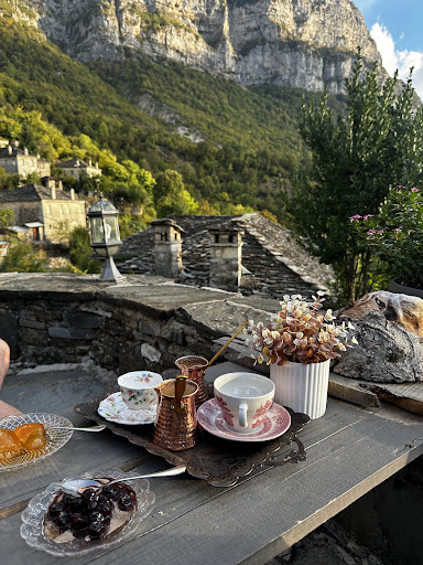 Είμαστε ζευγάρι που δουλεύουμε και οι δυο απίστευτο αριθμό ωρών καθημερινά. (11-12+). Κλείσαμε δωμάτιο για 2 βράδυα ώστε να μπορέσουμε επιτέλους να ξεκουραστούμε απολαμβάνοντας τη θέα και να χαλαρώσουμε μετά από μήνες δουλειάς χωρίς ξεκούραση. Επιλέξαμε το συγκεκριμένο λόγω κριτικών από το μπουκινγκ. Η θέα εκπληκτική, η εξυπηρέτηση σχετικά καλή αλλά οι τιμές είναι εξωφρενικές για αυτό που προσφέρει και όσον αφορά το καφέ και τα δωμάτια..Τα δωμάτια πάρα πολύ μικρά και το κακό είναι ότι δεν γίνεται να ξεκουραστεί κάνεις ειδικά μεσημβρινές ώρες γτ το καφέ που είναι ακριβώς έξω από τη πόρτα των δωματίων είναι συνεχώς ανοιχτό με παρέες και οικογένειες που έρχονται απλά για τον καφέ και να φύγουν. Τα δωμάτια δεν έχουν ηχομόνωση και όπως καταλαβαίνετε δεν μπορέσαμε να ξεκουραστούμε γτ υπήρχε μια μόνιμη βαβούρα, φωνές και τσιριδες από παιδιά και γονείς που προσπαθούσαν να τα ελέγξουν. Αυτό έγινε και τις 2 ημέρες που ειμασταν οπότε δεν είναι κάτι που έγινε απλά μια φορά.Πρεπει επιχειρήσεις σα τη συγκεκριμένη να επιλέξουν τη ταυτότητα τους, είναι μαγαζί με καφέ και ωραία θέα η παραδοσιακός ξενώνας; γτ από ότι φαίνεται είναι πετυχημένη επιχείρηση καφέ. Αν θέλει κάποιος απλά ένα δωμάτιο για να μείνει κατά τη διάρκεια του ταξιδιού στα Ζαγοροχώρια στο οποίο θα λείπει όλη μέρα και απλά θα έχει το δωμάτιο για ύπνο το βράδυ τότε ναι, να το επιλέξει, αν και αν θέλει κάτι γι'αυτό το λόγο είναι πάρα πολύ ακριβό. Για το πρωινό δεν μπορώ να πω κάτι καθώς και τα δύο πρωινά που ξυπνήσαμε δεν είχαμε ρεύμα και φάγαμε ότι έφτιαξαν οι οικοδεσπότες...