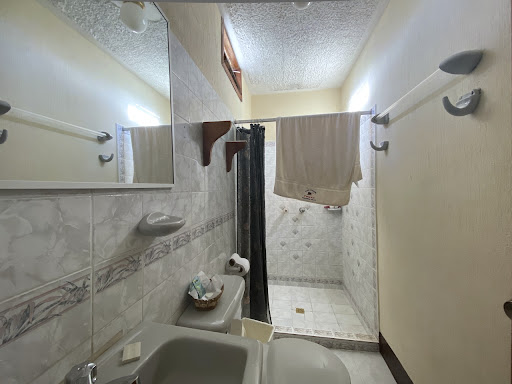 Moeilijk te vinden daar er twee recepties zijn maar alleen de tweede receptie aan het einde van de weg was bemand. Ik plaats foto's van de entree vanaf de weg en van de receptie, zodat de ingang duidelijker is. Hotel ziet er gezellig uit en is mooi groen. Receptionist regelt alles zakelijk vriendelijk en snel. Je krijgt daar het wachtwoord voor de wifi in de kamers, als je wilt ook de remote control van de tv. Er is een wasservice, deze kost 50 quetzal voor 1 kilo. Je was wordt snel schoon en netjes opgevouwen geretourneerd. In de tuin met gras, enkele bomen en bloemen die grenst aan de terrasjes zitten de gasten buiten aan tafeltjes en stoelen. Er hangen wasjes, er wordt wat gedronken, veel ontmoeting. Er is een dakterras met toiletten geen zwembad. Op dakterras staan slechts 2 stoelen en 1 tafel. Dus neem je stoel mee naar boven als je daar wilt zitten. De kamers in het gebouw van 2 verdiepingen zijn niet groot maar schoon en ruiken fris. Bedden zijn hard en je krijgt maar 1 handdoek per persoon. Ik had ook een wc rol die bijna op was. Volgende dag was dat aangevuld. In het raam zit een hor. De kamers zijn erg gehorig. Het is jammer dat er veel gasten zijn, vooral grote groepen, die denken dat zij de enige gasten zijn en veel lawaai maken. Hard praten, lachen en met deuren slaan in de nacht en 's avonds laat. Heel vervelend als je de volgende dag vroeg moet opstaan en vermoeid de dag begint door dit asociale gedrag van deze gasten. De receptionist is dan al vertrokken dus want de receptie sluit om 23 uur. Het hotel kan er niet veel aan doen. Misschien een bordje ophangen met het verzoek om rust na 23 uur? Ook begint om ongeveer half 4 een haan te kraaien die daar niet meer mee wil stoppen. Oordoppen meenemen dus. Er is in de kamer geen airco, ventilator, drinkglazen of föhn. Er stond bij aankomst ook geen flesje water, zoals ik wel veel heb gezien in hotels deze maand. Dat lijkt mij een kleine moeite met niet veel extra kosten en het is erg gastvrij om water en een glas aan te treffen vooral bij late aankomst. Niet in alle stopcontacten kun je je telefoon opladen. Bij mij lukte het opladen wel in de badkamer. Douche werkte prima, met boiler, dus soms is het warm water even op als veel mensen tegelijk hebben gedoucht. Ik had twee losse bedden, kamer 7 beneden, soms staan er meer bedden. De bedden zijn wel kort dus lange mensen moeten dwars liggen. In de tuin staan ook huisjes met keuken en zitkamer. Ik ben daar niet binnen geweest naar zag er leuk, schoon en netjes uit. Er is een ontbijtrestaurant. Lunch en diner doe je elders. Prima ontbijt! Volop keus in restaurants op korte loopafstand. Het prachtige meer, bootjes voor dagtochten en de Santanderstraat met marktkraampjes zijn ook op zeer korte loopafstand. Al vond ik de verkopers erg opdringerig. Je kunt wel afdingen, daar houden ze al rekening mee bij hun vraagprijs. Ga zeker ook met een bootje naar San Juan- en San Pedro La Laguna. Is te combineren met Santiago. De ligging van dit hotel is goed en voor 1 of 2 nachten een goede pleisterplaats voor een levendig, maar...