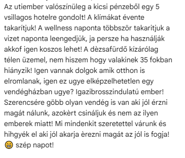 Ugyanabban a turnusban, ugyanabban a társaságban voltam, mint az előttem kritikát megfogalmazó vendég.