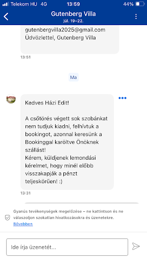 Mélységesen felháborító, amit a Gutenberg Villa művelt velünk. A hónapokkal korábban lefoglalt és kifizetett szobánkat az érkezés napján, 13:30-kor (!) mondták le – fél órával a hivatalos becsekkolás előtt – állítólagos csőtörésre hivatkozva (mosolygós fej az üzenet végén befigyel azért………)Telefonhívásra nem reagáltak, de amikor a férjem egy másik számról hívta őket, AZONNAL felvették. Ez nem hiba – ez SZÁNDÉKOS MEGTÉVESZTÉS.