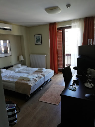 This hotel was excellent value for money. It is situated on a quiet street but not far from the beach or the promenade. It's about 20-30 Minutes walk from the train and bus station and probably 15-20 Minutes from the town center. The staff is super nice as well and let me leave my luggage at the hotel so I could go and explore the town and lake. In addition to Hungarian they also speak English and German.||||I stayed in a double room on the bottom floor with a patio with two chairs and a small table. There was also a TV, which I didn't switch on, so, I have no idea what channels they provide you with. There's also a large wardrobe with full sized mirrored doors as well as a chest of drawers. There's also a small bedside table with a small drawer. The bed was super comfy with a huge and a small pillow, which is nice if you want to read before going to sleep. The bathroom was huge, with a shower, toilet and sink. They provide a large, medium and a small towel as well as a hair dryer. Everything was super clean and modern. Unfortunately, their free wifi wasn't working so well for me.||||Breakfast was also nice. They offer orange juice, different types of coffee and teas, orange juice, different kinds of cereal, different types of bread, various cheeses and cold cuts (I would have preferred maybe a slightly better quality of the meat), and cake. ||||I would definitely recommend this hotel and...