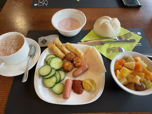 Now the problems. The room was not maintained well. The carpet had stains. One of the lamps had a broken bulb. The comforter provided with the extra bed had dust and other people's hairs stuck on it. 4. The AC was making grinding noises, and didn't even cool the room. The cupboard was honestly too small for anything. The TV could use an update. The bathroom mirror light had a cracked protective plastic shell. The sink didn't drain very well. The shower kept sliding down since the locking mechanism was broken. The same state of disarray was observable in the corridors on my floor. The room servicing trolleys with all the used linen and towels was stored in the open, and a crib was just stowed away next to my door. And this remained the state of things from my check-in until my check-out. Although breakfast tasted good, the plates were way too small, and most of the items weren't labeled. It isn't a problem for frequent travellers and those acquainted with the continental breakfast menu, but for first-timers it would probably be a nightmare to figure out which is what.