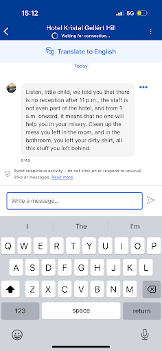 I arrived with my 6-year-old child and my elderly mother. I asked if we could use the toilet since we weren’t allowed to check in early. I was told there was no toilet available and that leaving our luggage would cost €5. When I said it was unacceptable that they wouldn’t even let me take my child to the toilet, we were kindly told to leave. Above, you can see how this person communicates through Booking and their overall attitude toward guests. Thankfully, I ended up taking my family to stay at a proper hotel in the center of Budapest instead of dealing with...